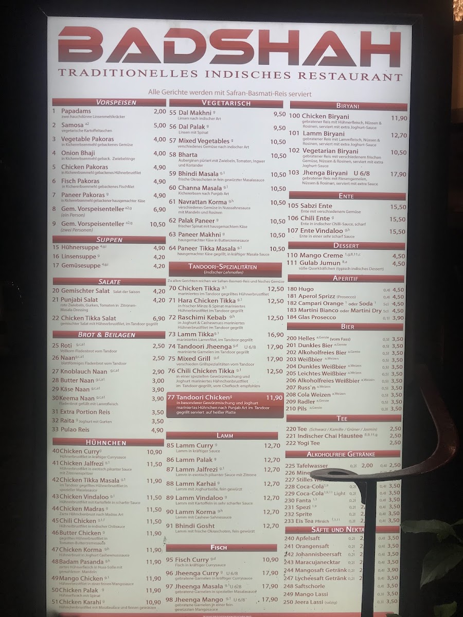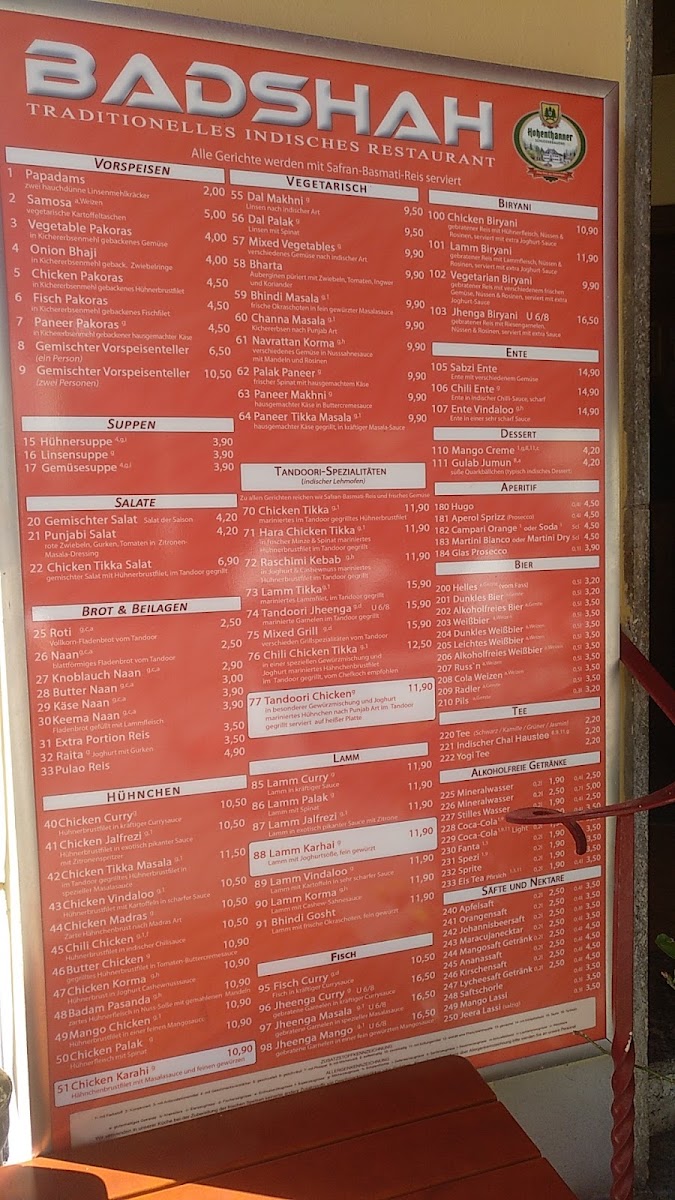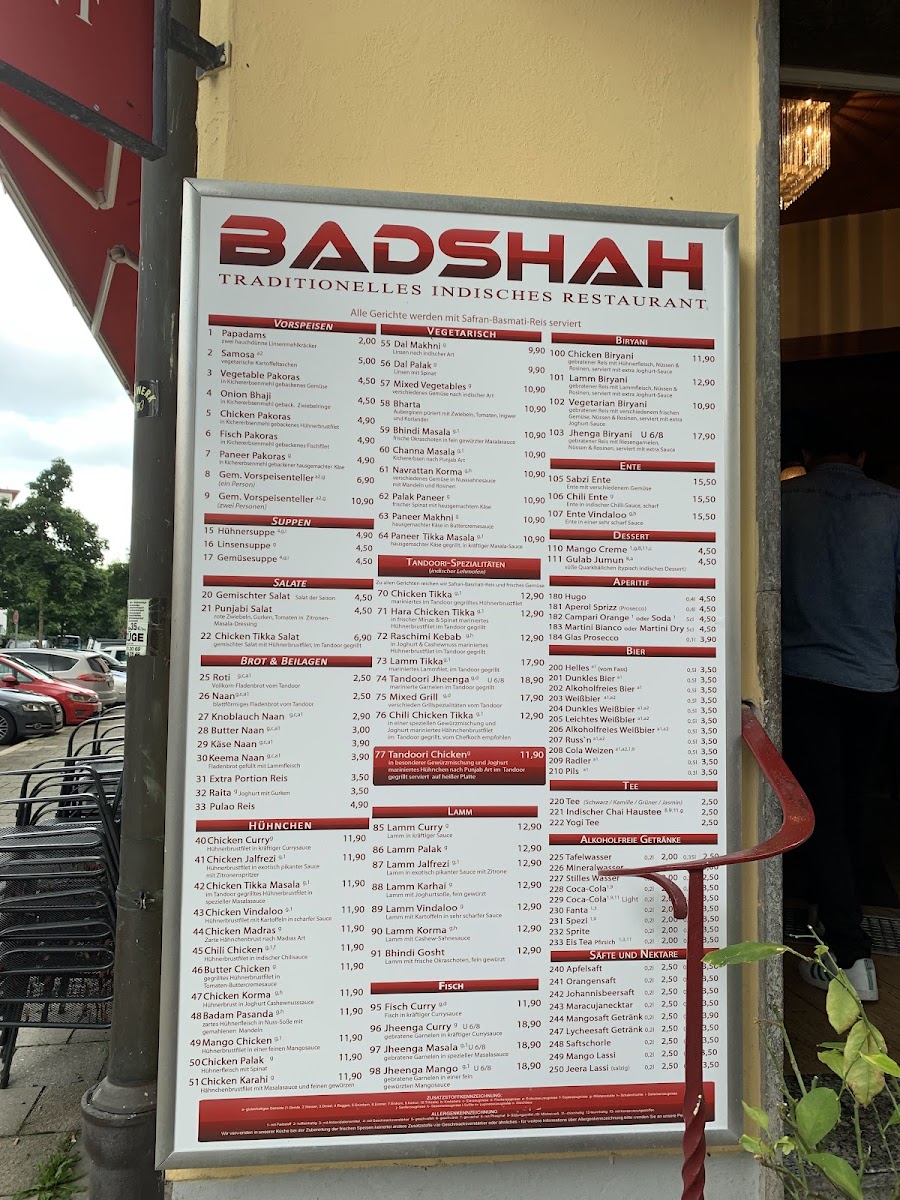 For those seeking lighter options, the Salat provides a refreshing balance, and the Badshah Suppe is a warming, flavorful soup that makes a perfect start to any meal. Don’t forget to sip on the traditional Indisches Tee to round off the experience, enhancing the meal with its aromatic and soothing properties.